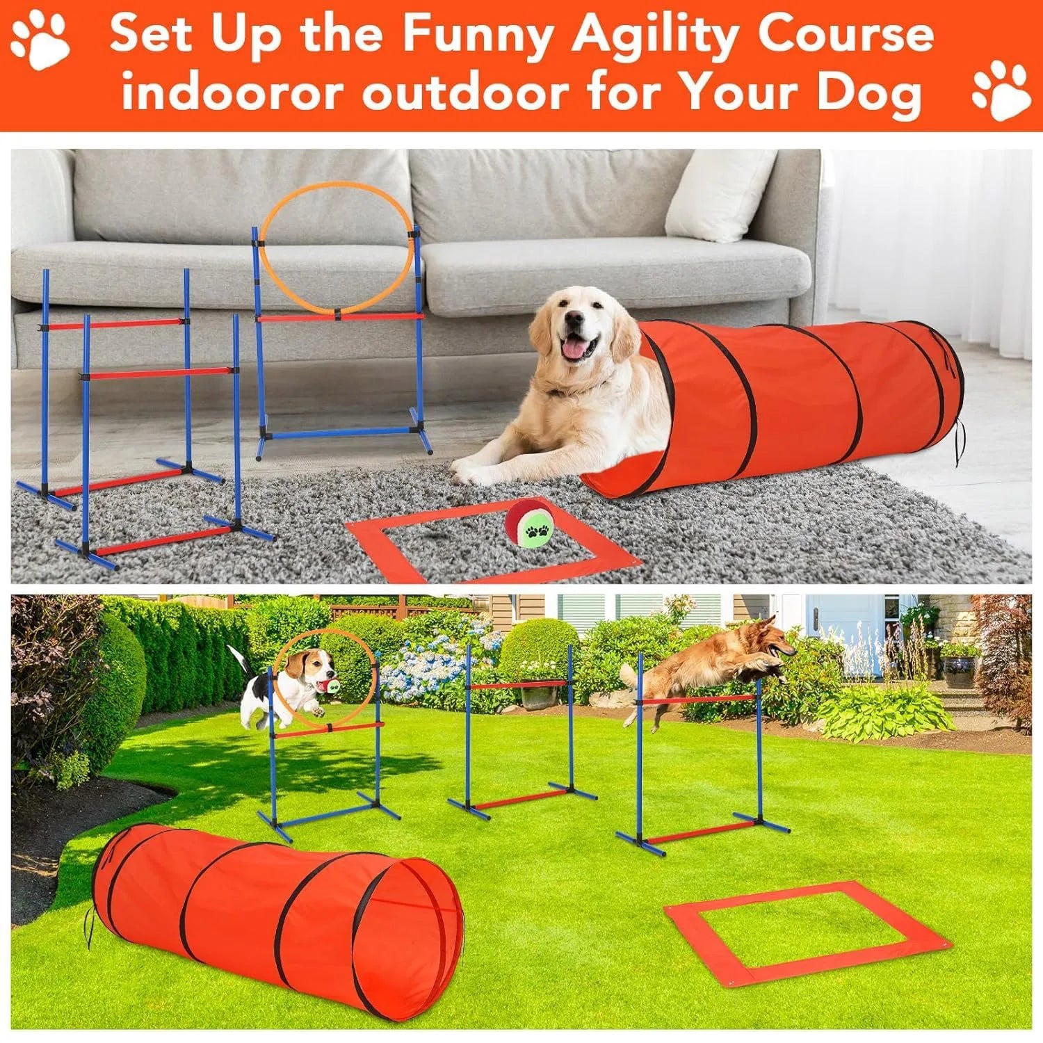 Dog Agility Course Backyard Set Dog Obstacle Course Training Starter Kit with Tunnel, Puppy Agile Training Hurdle Adjustable